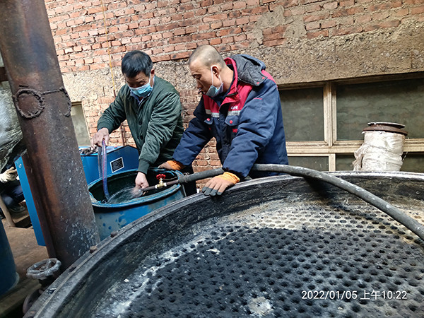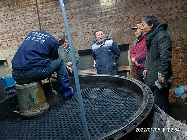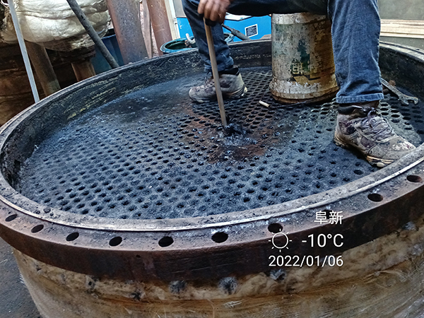 2022年1月24日星期一,虎年(農(nóng)歷臘月二十二)大寒季節(jié),室外時(shí)溫零下—16℃,遼寧省彰武縣興隆山鄉(xiāng)老虎坨子村,阜新市彰武縣達(dá)凱化工有限公司糠醛廠,在高經(jīng)理的精心安排下,蘇振山廠長給我們指導(dǎo),積極與我們河南都市機(jī)械設(shè)備有限公司喬俊陽技術(shù)員配合,改制了一款寬槽橡膠滑輪,對(duì)結(jié)垢堅(jiān)硬,徹底燒干堵死的廢水蒸發(fā)器管子進(jìn)行疏通,清理,經(jīng)過實(shí)驗(yàn),既節(jié)省了人力,又安全,又快捷,確實(shí)是值得分享的好辦法!