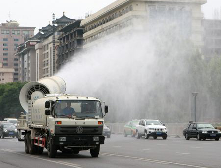采用高壓水泵和特殊噴嘴將水霧化成直徑約10~200μm的水霧,通過(guò)高性能的遠(yuǎn)射風(fēng)機(jī)將水霧送到粉塵集中處,水霧與粉塵結(jié)合、吸附、成團(tuán)、變重,在自身的重力作用下沉降到地面,從而達(dá)到有效降塵的目的。有效除塵率可達(dá)95%